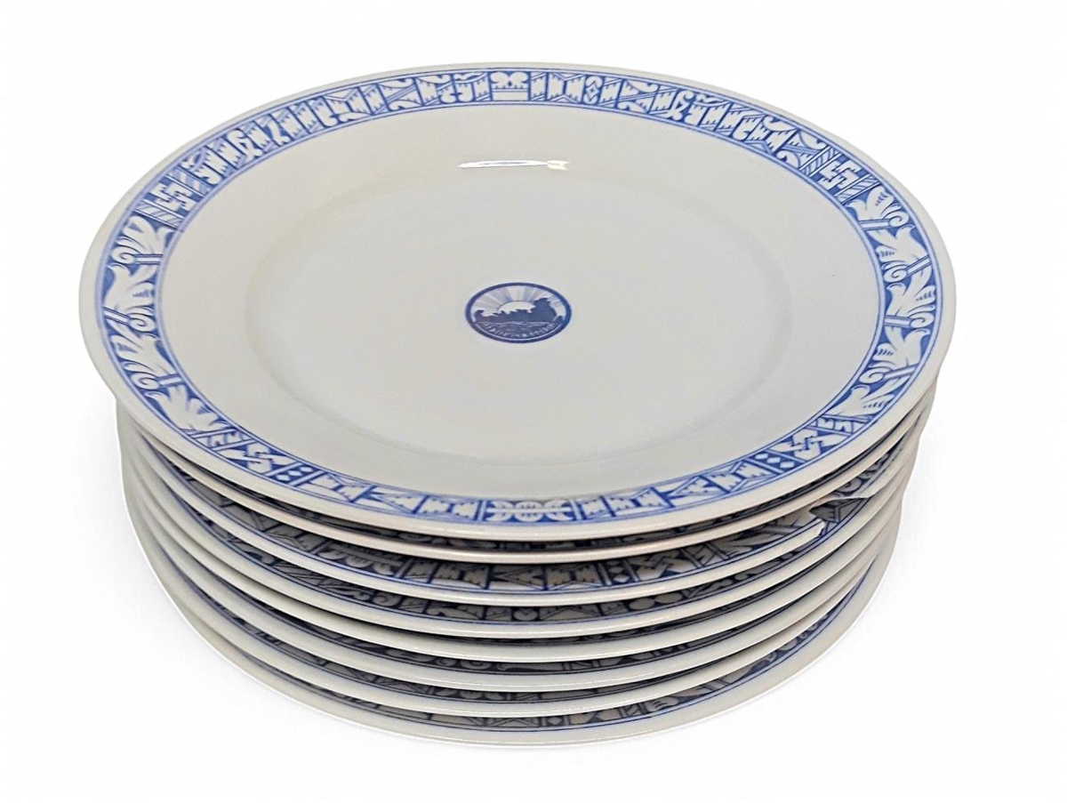 Á allt leirtauið er prentuð höfðaletursrönd í bláum lit. Á diskum stendur: ALÞINGISHÁTÍÐ ÍSLANDS 930-1930 en á bollum stendur: ALÞINGISHATIDIN 1930. Á diskum er merki alþingishátíðarinnar á miðjum disk.