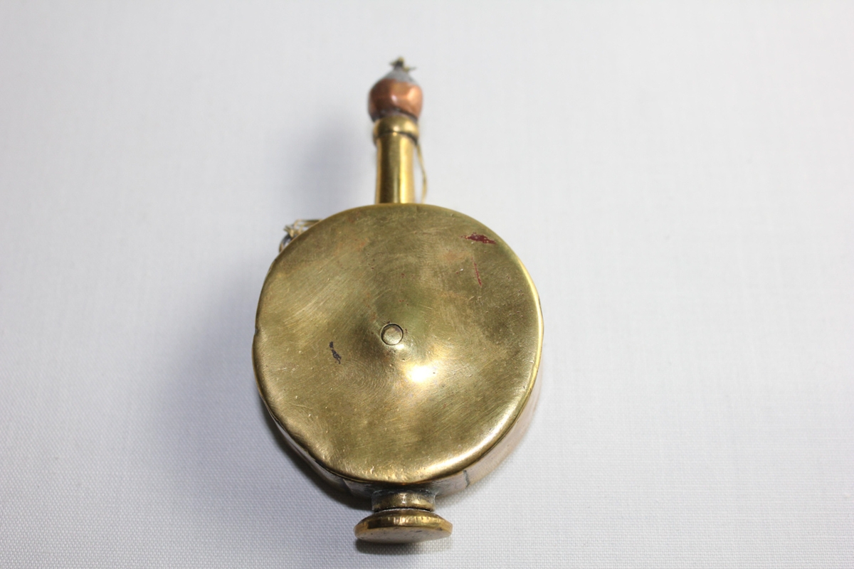 Úr messing, kringlótt dós með stétt og stút. Dömubaukur.
