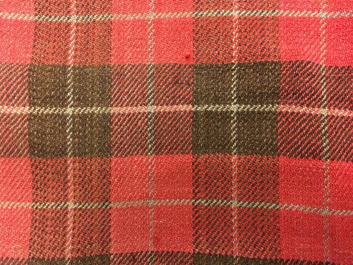 Rúmábreiða, værðarvoð, handvefnaður, vaðmálsvefnaður, köflótt, litir: rauður og brúnn, ljósar rendur.