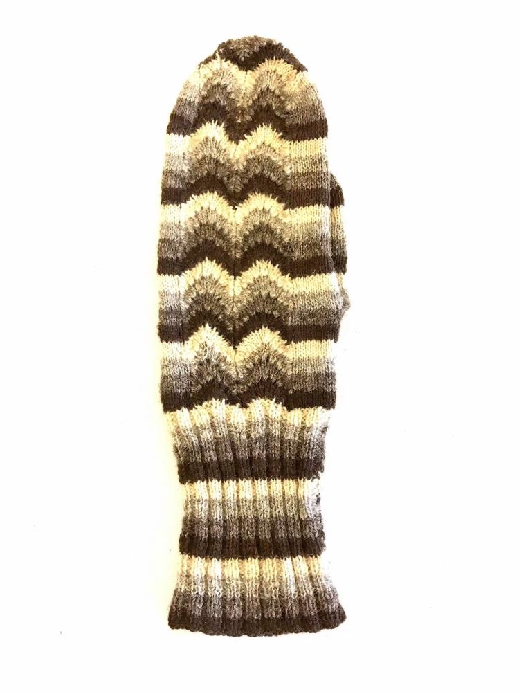 Ljósmórauðir vettlingar með mórauðum, hvítum og svörtum röndum. Ullina í vettlingana vann í band Sigrún Jónasdóttir þá 66 ára en prjónaðir eru þeir af Sigurlaugu Jónsdóttur Fornastöðum í Fnjóskadal þá 76 ára gamalli.