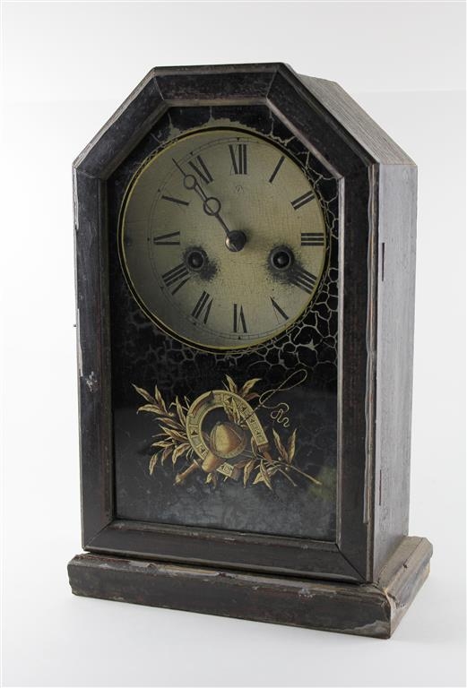Með glerhurð og máluðu skrauti. Rómverskir tölustafir. Skífan úr pappa. Áletrun: Junghans. Hæð 28,5 sm, breidd 17 sm, þvermál 9 sm.