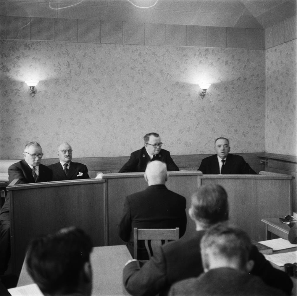 Í dómssal Vestmannaeyja, Hilmisgötu 4. Sjódómur að störfum. Frá vinstri, Páll Þorbjörnsson, Þorsteinn Jónsson frá Laufási, Torfi Jóhannsson bæjarfógeti og l.t.v. aftast er Freymóður Þorsteinsson fógetafulltruí. Sennilega er landhelgisbrot á dagskrá.