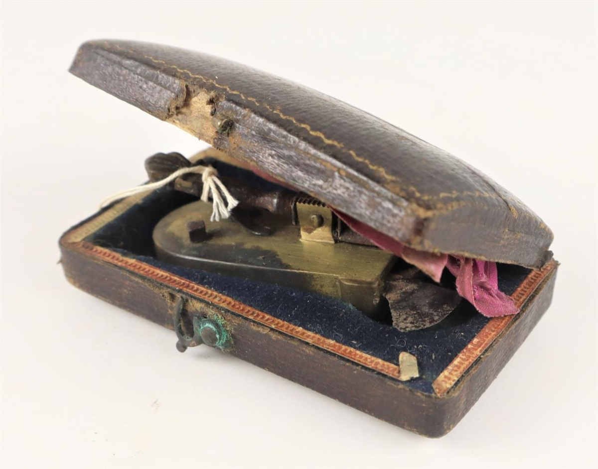 Blóðtökubíldur úr látúni með járnskreppu. Einfaldur hnífur í öskju, askjan fóðruð með bláu flaueli.