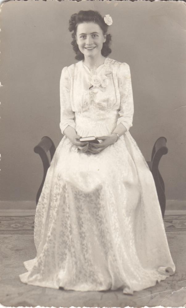 Fermingarstúlka í síðum glansandi kjól, blómamunstur í efninu og blómskreyting við hálsmálið og í hári stúlkunar.