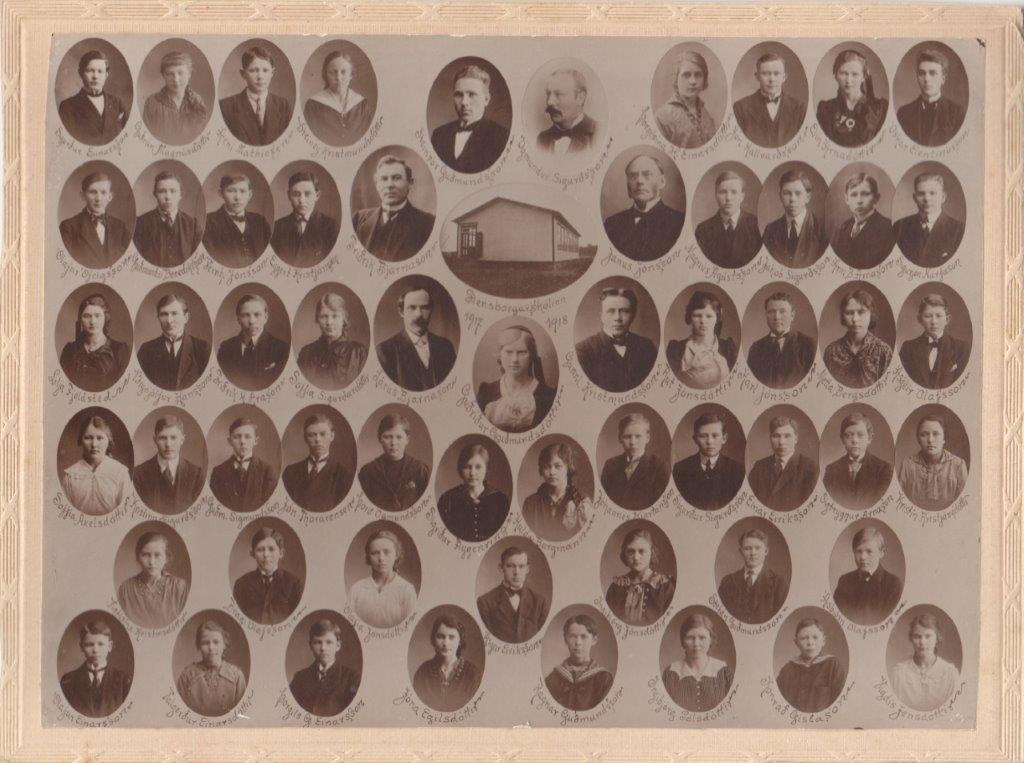 Bekkjarmynd úr Flensborgarskóla. Nemendur og kennarar. Fyrir miðri myndinni er skólahúsið sem byggt var 1906.6. röð. Efst f.v. :Sigurður Einarsson, Guðrún Magnúsdóttir, Árni Mathíesen, Steiney Kristmundsdóttir, Steinþór Guðmundsson, Ögmundur Sigurðsson, Þorgilsína Helga Einarsdóttir, Jón Hallvarðsson, Elín Árnadóttir, Óskar Elentínusson.5. röð f.v.: Ólafur Ófeigsson, Guðmundur Benediktsson, Vernharður Jónsson, Eggert Kristjánsson, Friðrik Bjarnason, Janus Jónsson, Magnús Ágústsson, Jakob Sigurðsson, Árni B. Árnason, Sigurjón Narfason. 4.röð f.v. : Lilja Fjelsted, Brynjólfur Hansson, Friðrik Arason, Soffía Sigurðardóttir, Lárus Bjarnason, Guðríður Guðmundsdóttir, Gunnlaugur Kristmundsson, Rut Jónsdóttir, Karl Jónsson, Metta Bergsdóttir, Ásgeir Ólafsson.3. röð f.v. : Soffía Axelsdóttir, Kristinn Sigurðsson, Guðmundur Sigmundsson, Jón Jónsson Thorarensen, Þorvaldur Ögmundsson, Sigríður Flygenring, Hulda Bergmann Sigfúsdóttir, Jóhannes Kjartansson, Sigurður Sigurðsson, Einar Eiríksson, Sigtryggur Árnason, Kristín Kristjánsdóttir.2. röð f.v.: Vigfúsína Kristinsdóttir, Bragi Ólafsson, Ólafía Jónsdóttir, Ásgeir Eiríksson, Ingibjörg Jónsdóttir, Stefán Guðmundsson, Ásbjörn Ólafsson.1.röð f.v. Ólafur Einarsson, Valgerður Einarsdóttir, Þorgils G. Einarsson, Jóna Egilsdóttir, Ragnar Guðmundsson, Ingibjörg Pálsdóttir, Konráð Gíslason, Vigdís Jensdóttir.