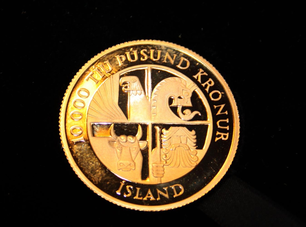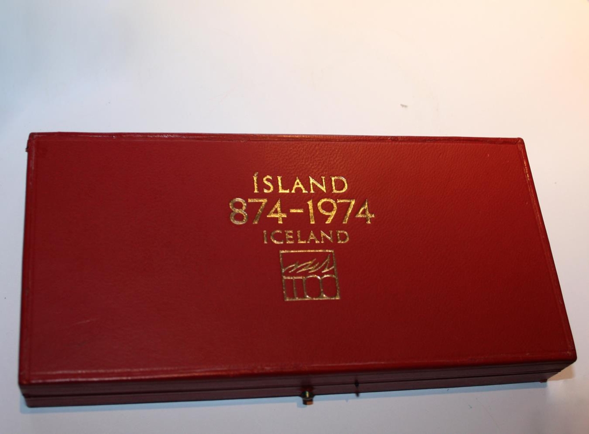Þrjár myntir í rauðri öskju sem eru gefnar út í tilefni 1100 ára afmæli Íslandsbyggðar.