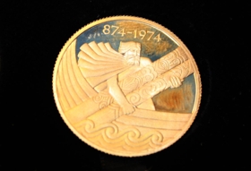 Á framhlið: Landvættir, stílfærð mynd. Á bakhlið: Ingólfur Arnarsson landnámsmaður varpar öndvegissúlum fyrir borð.
