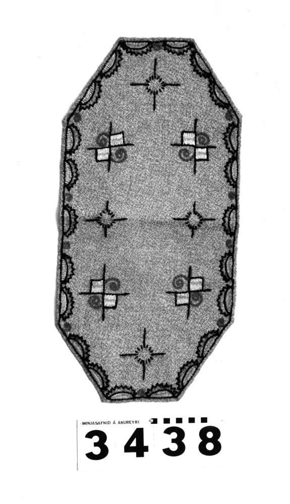 ullarefni, saumað í með bleiku og grænu. Dúkurinn er mjórri til enda.
