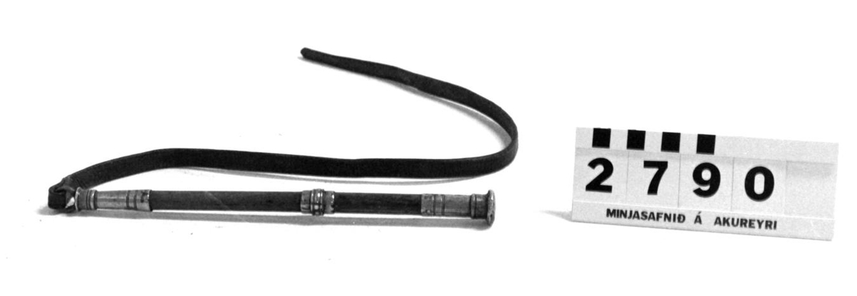 þremur silfurhólkum og leðuról, lengd á skafti 26 sm.