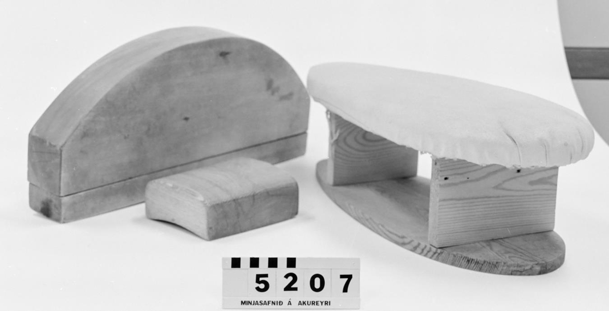 Pressuklossar m.a. fyrir skálmar, ermar og axlir. Lítið straubretti/ermabretti klætt með taui sem fest er með koparnöglum málin á því eru gefin upp hér að ofan. Tveir tréklossar annar fyrir axlir, mál: 52 x 7,5 x 23,3. Hinn fyrir skálmar, mál: 16,5 x 13,8 x 6,7.