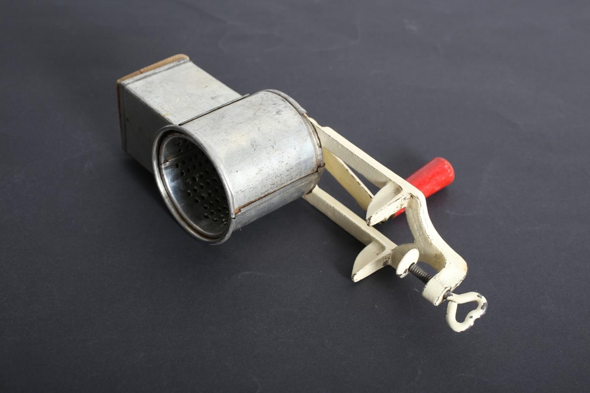 Lítil kvörn/rifjárn, handsnúin, til að festa á borð. Hlutinn sem festist við borðið er gulhvítur en einnig sveif sem er svo með rauðu handfangi. Kvarnarhlutinn sjálfur er úr járni og hægt er að skipta út hnífnum sem snýst inn í kvörninni þegar sveifinni er snúið. Engir aðrir hnífar fylgja þó með. Gefið af börnum Steinunnar Guðnadóttur og Þórðar Stefáns Benediktssonar, Laugavöllum á Egilsstöðum.