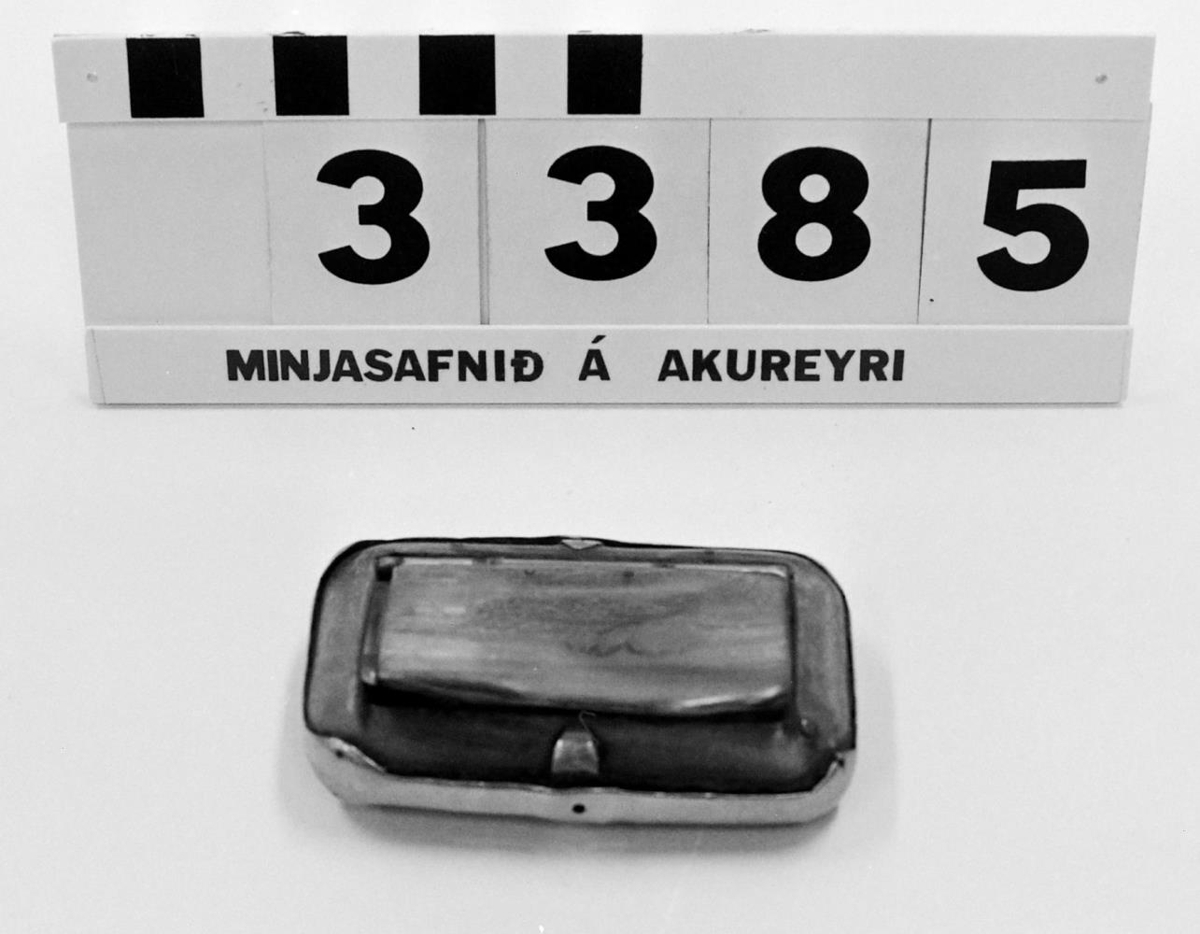 úr ljósu horni, silfurbúnar með skorinni rós á loki. Dósirnar eru