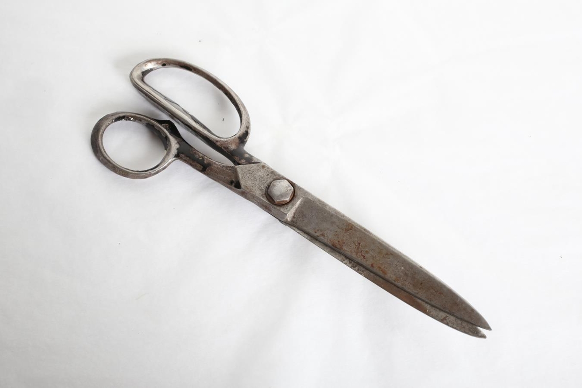Hefðbundin skæri úr járni. Hafa eitt sinn verið svört, eins og sést á nokkrum stöðum. Orðin nokkuð ryðguð. Á þeim stendur: "Steelforged No. 30". Gefið af börnum Steinunnar Guðnadóttur og Þórðar Stefáns Benediktssonar, Laugavöllum á Egilsstöðum.