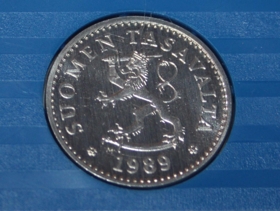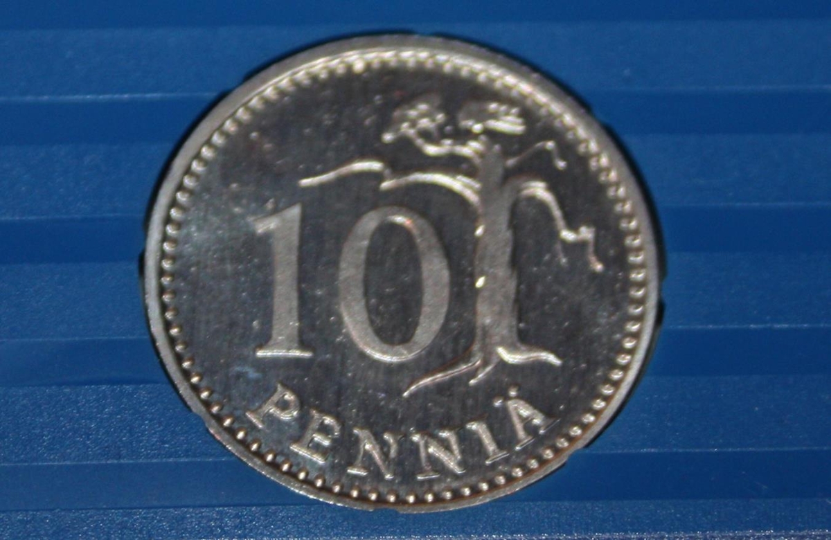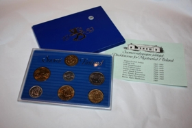 Sex myntir og einn minnispeningur á spjaldi í öskju.