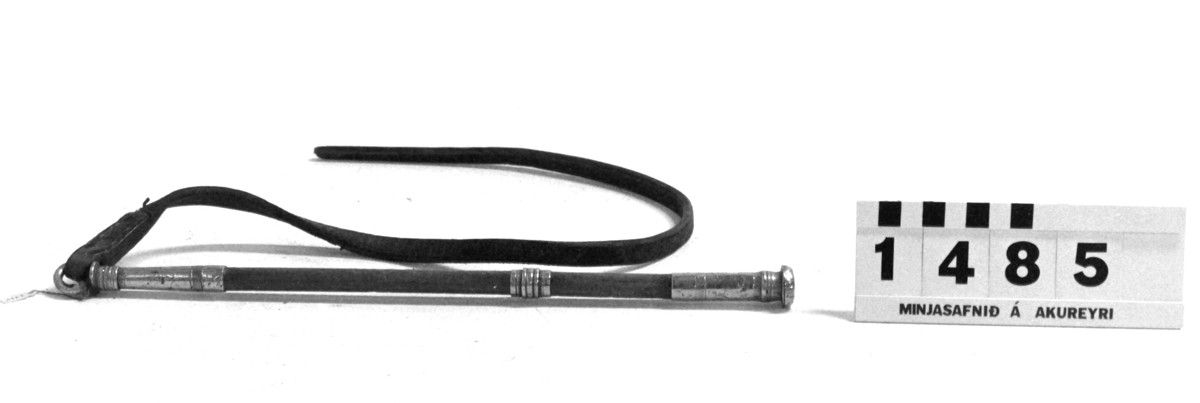 Svipan er með þremur silfurhólkum ,leðuról og grafið er á hettu