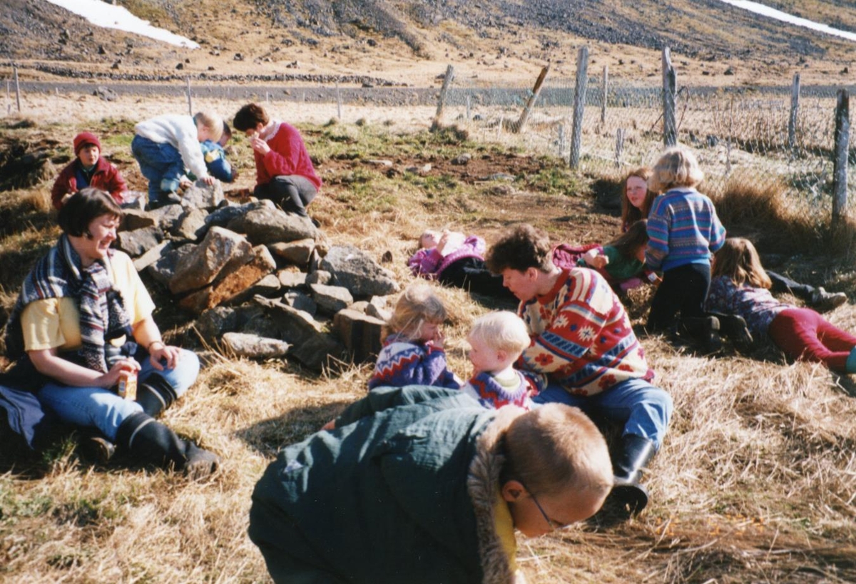 Skólaferðalag fyrir strandir 12. maí 1994. Nestisstund á Reynikeldu.