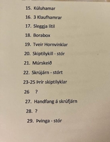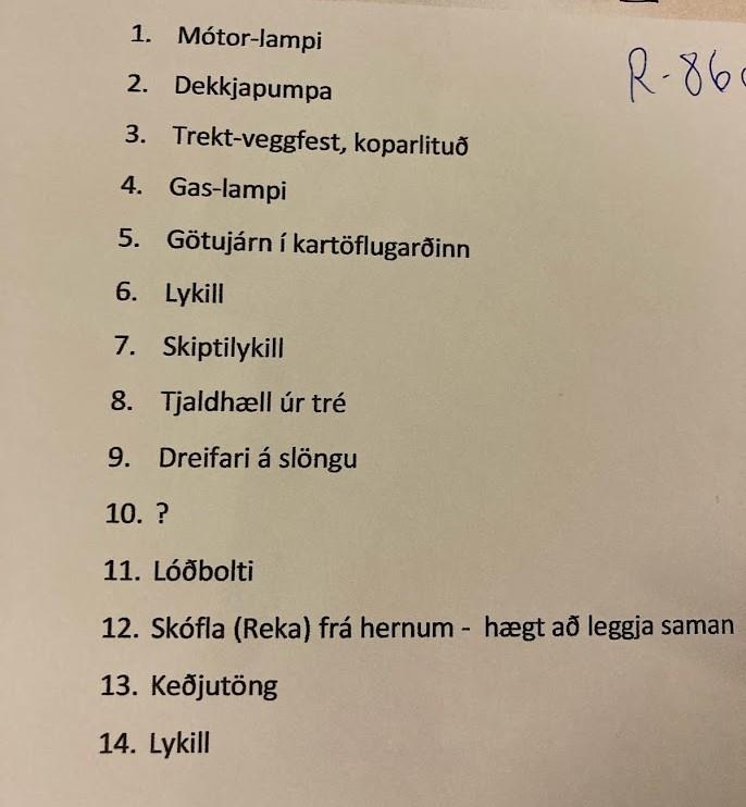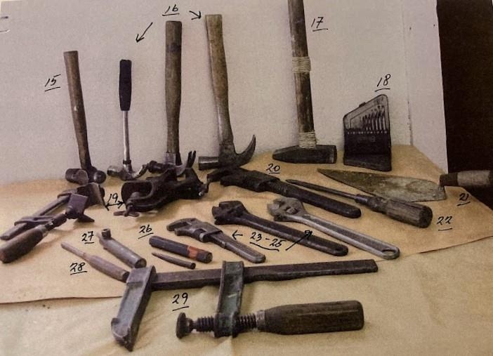 Verkfæri og áhöld úr bílskúr Alberts Jónassonar þegar hann bjó í Nökkvavogi. Eru þar kúluhamar, klaufhamar, sleggja, borar, skiptilykill, múrskeið ofl. Einnig eru mótorlampi, dekkjapumpa, keðjutöng, skófla frá hernum o.fl.