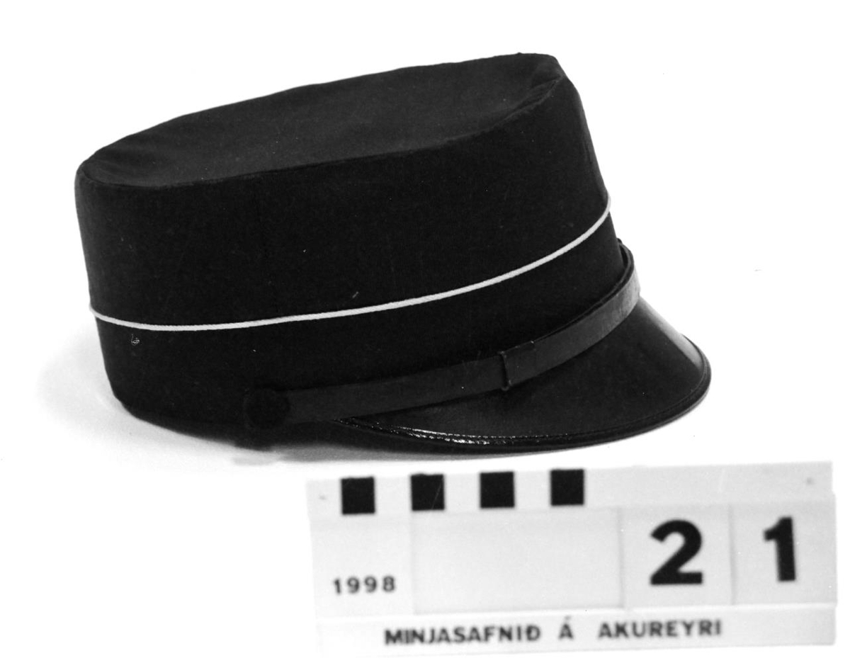 leðurskyggni og hökubandi úr leðri. Ljós snúra er tyllt utan á húfuna.