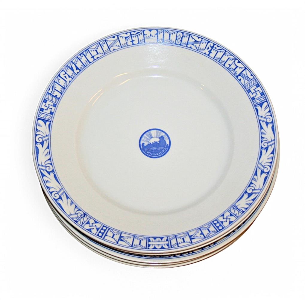 Á allt leirtauið er prentuð höfðaletursrönd í bláum lit. Á diskum stendur: ALÞINGISHÁTÍÐ ÍSLANDS 930-1930 en á bollum stendur: ALÞINGISHATIDIN 1930. Á diskum er merki alþingishátíðarinnar á miðjum disk.