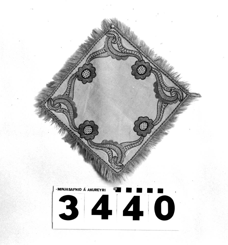 úr drapplituðu ripsefni með saumuðum rósum úr marglitu garni og gulu