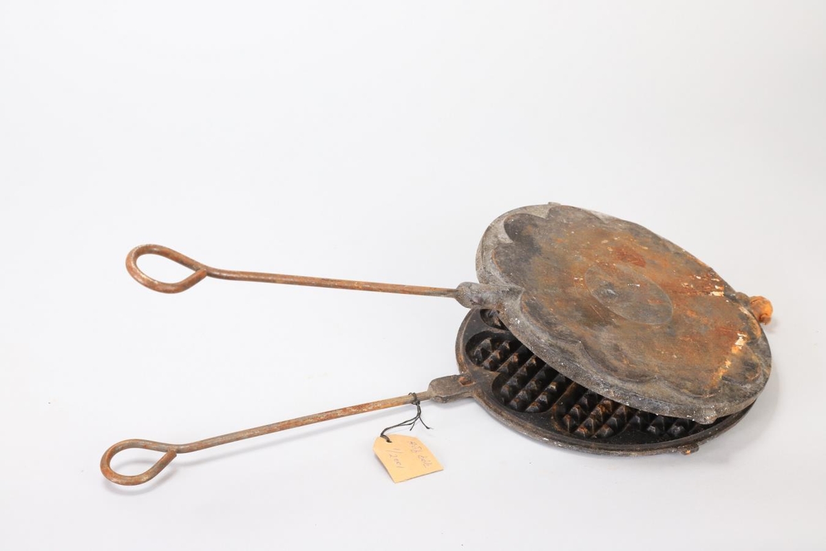 Gamalt vöfflujárn úr járni. Sömu gerðar og yngri vöfflujárn sem komu hingað eftir stríð, en þau voru úr áli.