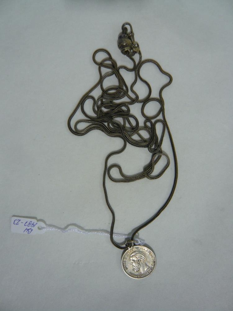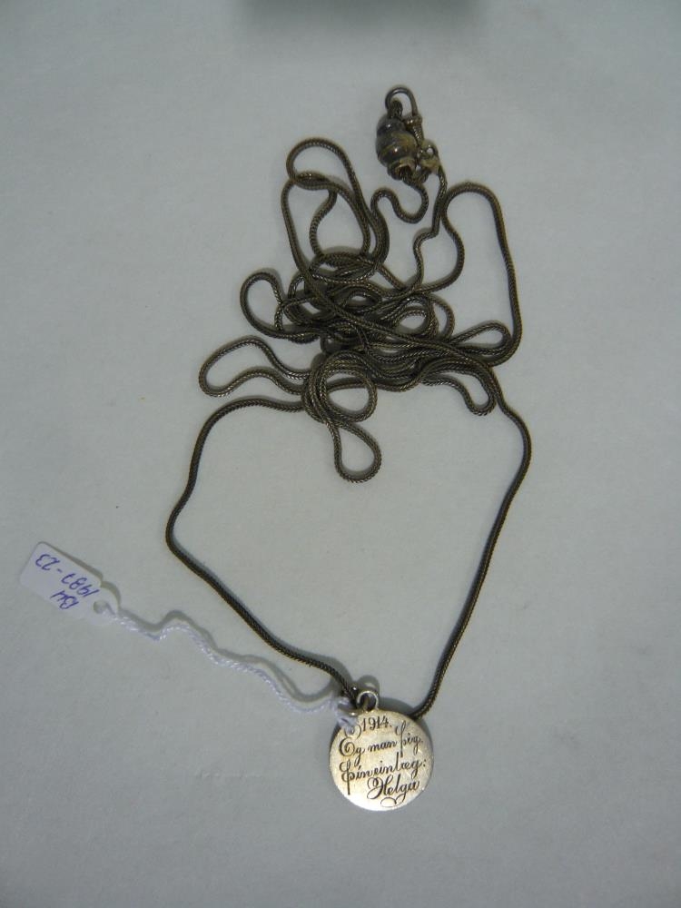 Festi, mjög grönn og fínleg, 132 cm, ætluð til að bera um hálsinn, en hægt er að festa úrið við hana. Festur er við hana meðalstór peningur. Öðrum megin á honum er Óskar II sem var konungur Svía 1873-1907 en hinu megin hefur hann verið slípaður og síðan grafið á hann: