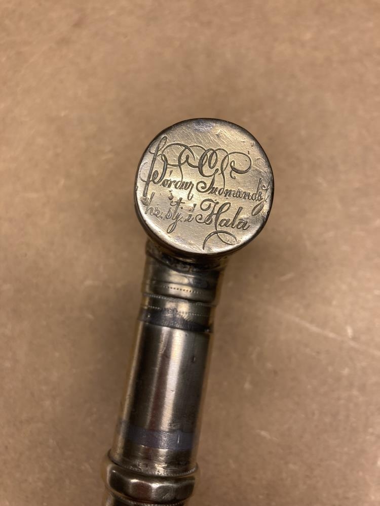 Stafur Þórðar Guðmundssonar hreppsstjóra í Hala, smíðaður af Oddi Oddsyni í Regin. Silfurbúinn og grafinn (skreyttur). Áletrun: Þórður Guðmundsson hr.stj. á Hala. Þökk fyrir 16 ára störf. St.fél. Þetta er minningargjöf frá Stokkseyrarfélaginu.