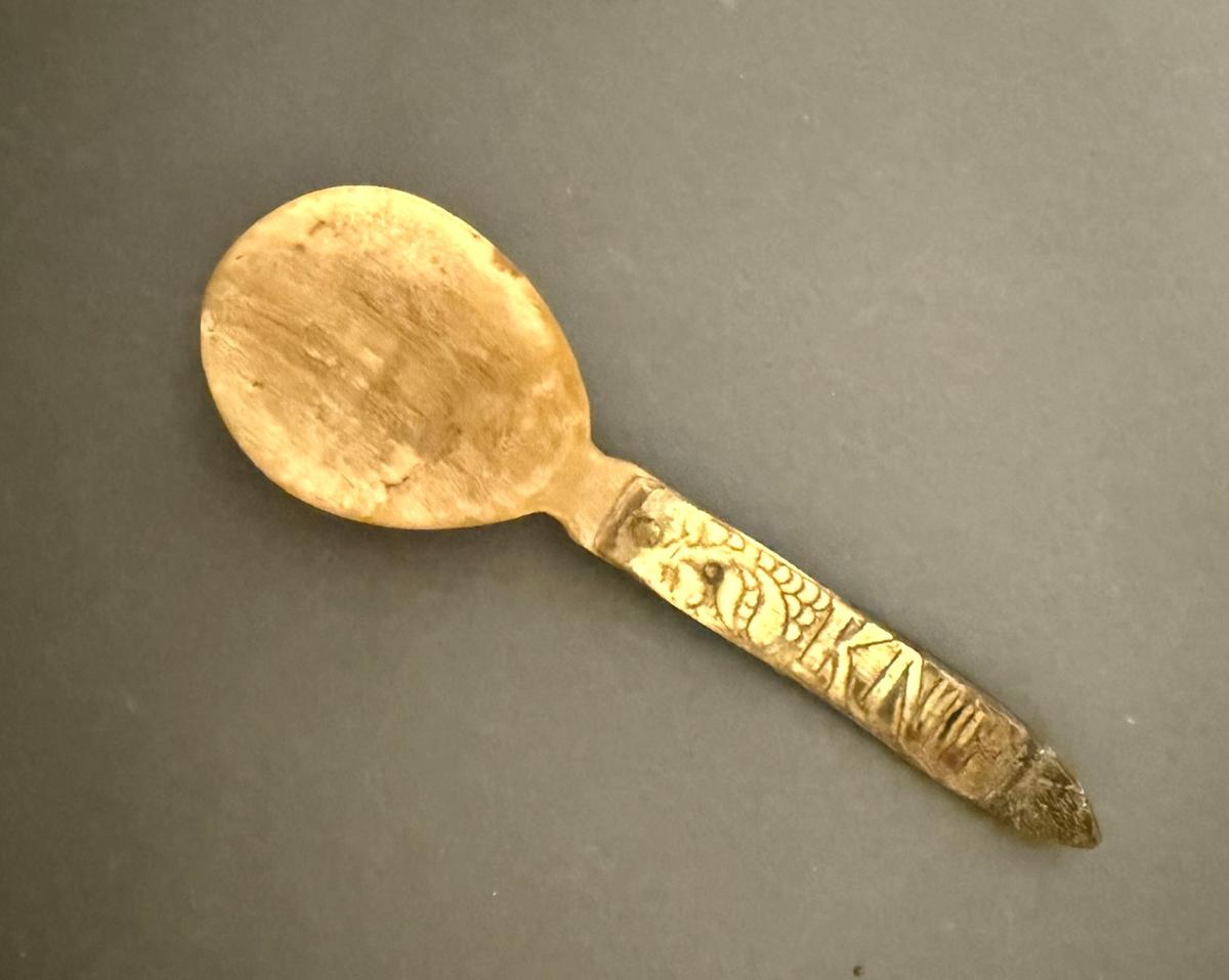 Spónn, smíðaður af Kristófer Jónssyni á Vindási, föður gefanda. Skaftið að nokkru úr öðru horni og fest með hnoðnöglum. Á það er letrað: K.N.F.