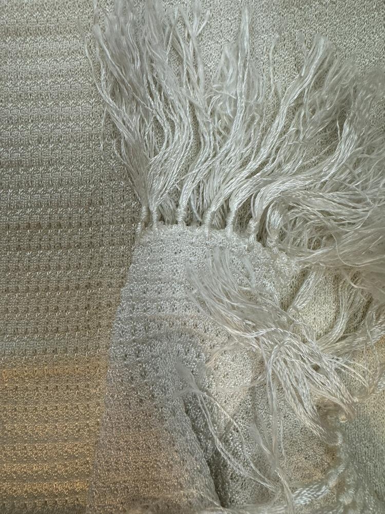 Sjal úr ljósu efni með ljósu kögri. Peysufata- eða upphlutssjal.