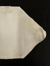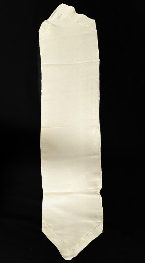 Slifsið er úr ljósu hvítu þunnu efni og mjög stutt.