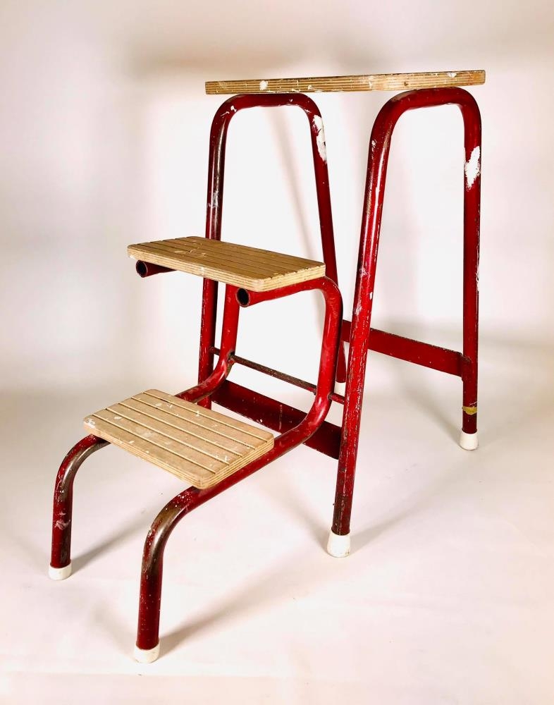 Tröppustóll með rauðustelli og trésetu. Stóllin líklega keyptur á Akureyri um 1960.