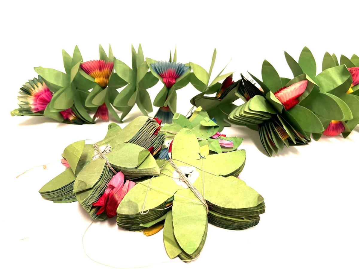 Fjórar jólalengjur úr pappa og kreppappír, græn lengja eins og lauf sem dregst út og mislit blóm spretta út inn á milli.