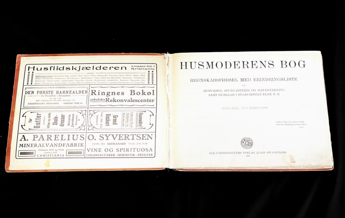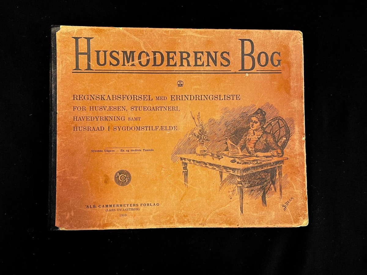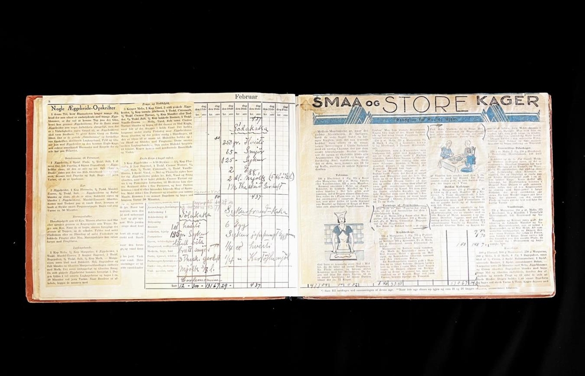 „Husmoderens Bog", búið er að líma uppskriftir inn í bókina.