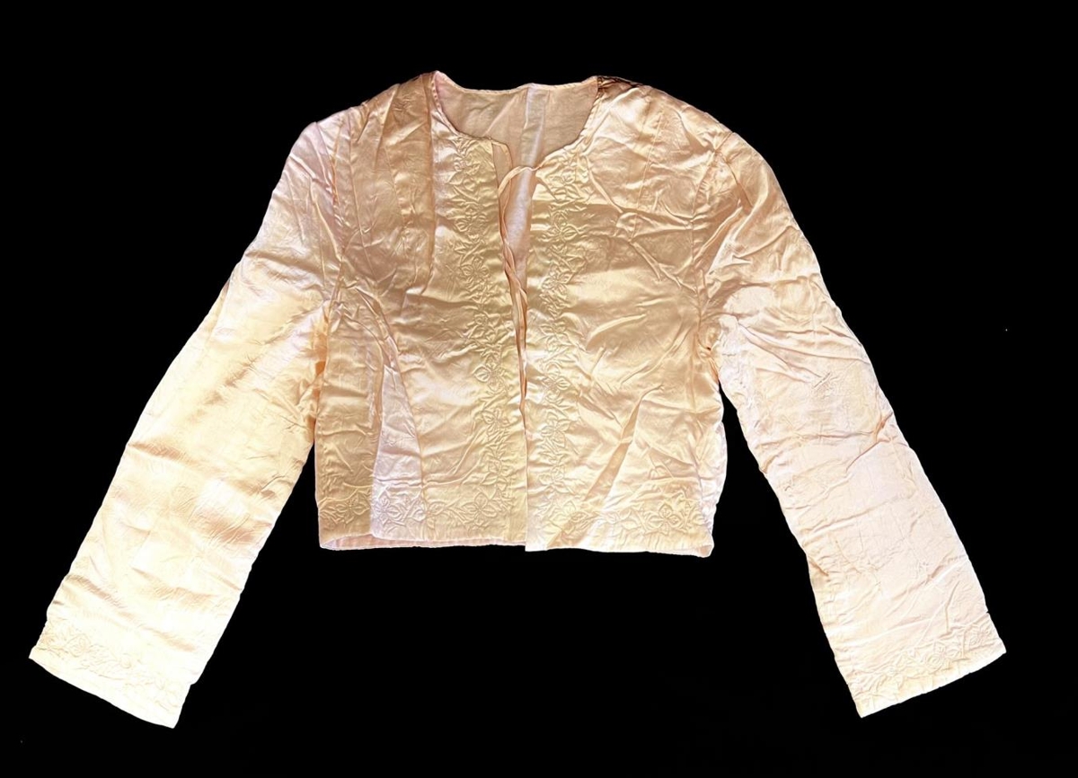 Fölbleikur með rósamunstri á köntum. Hægt að binda saman við hálsmál.