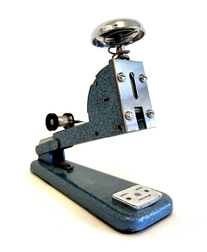 Blár heftari úr málmi. silfurlituð skífa þar sem þrýst er niður.