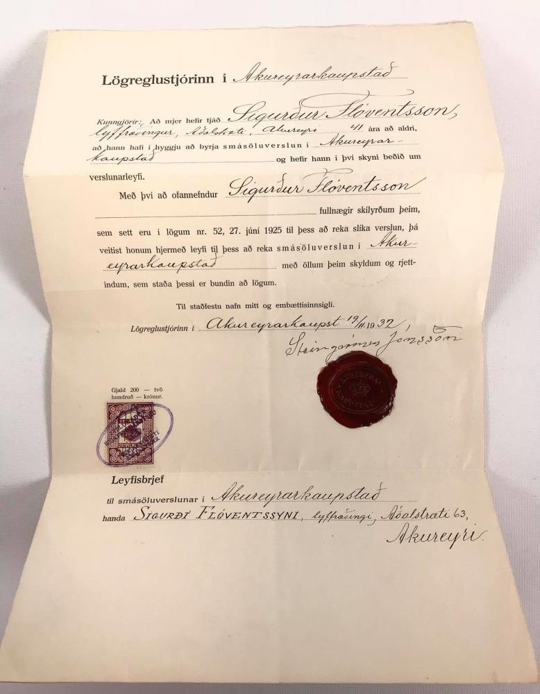 Leyfisbréf útgefið af lögreglustjóranum í Akureyrarkaupstað árið 1932. Verslunarleyfi gefið út fyrir Sigurð Flóventsson, lyfjafræðing 41 árs að aldri - Aðalstræti Akureyri. Undirritað af Steingrími Jónssyni, lögreglustjóra 19.11.1932. Með innsiglisvaxi og stimpli sem og stipilgjaldi 200 kr.