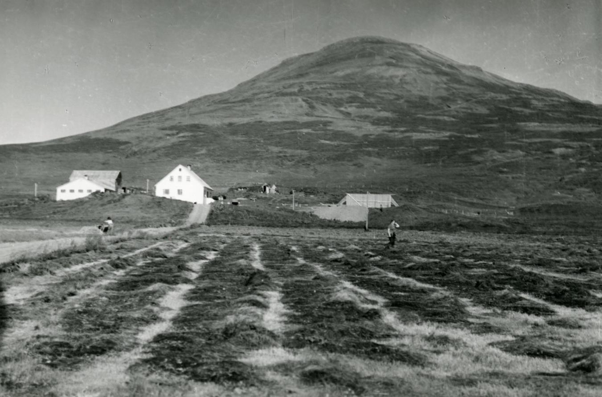 Stóra-Tunga á Fellsströnd. Fyrir miðri mynd sést gamli Stóru-Tungubærinn enn uppistandandi. Til hægri sést íbúðarhúsið í Galtartungu í byggingu. Tungumúli ofan við bæinn. Líklega er það Agnes Eyrún Pétursdóttir sem stendur með hrífuna í flekknum.