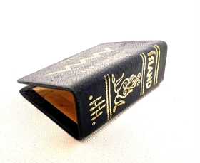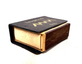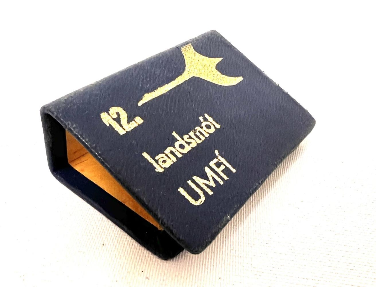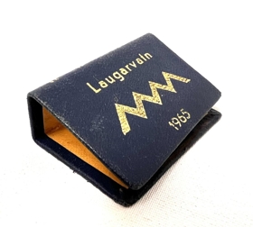 Hulstur utan um eldspýtustokka. Blátt leður og gylling, innan í er eitthvað stíft sem heldur hulstrinu alveg stífu þannig það klemmist vel utan um stokk. Áletranir á öllum hliðum og stendur; Laugarvatn (merki skólans? Burstir) 1965. 12. landsmót UMFÍ. Ísland.