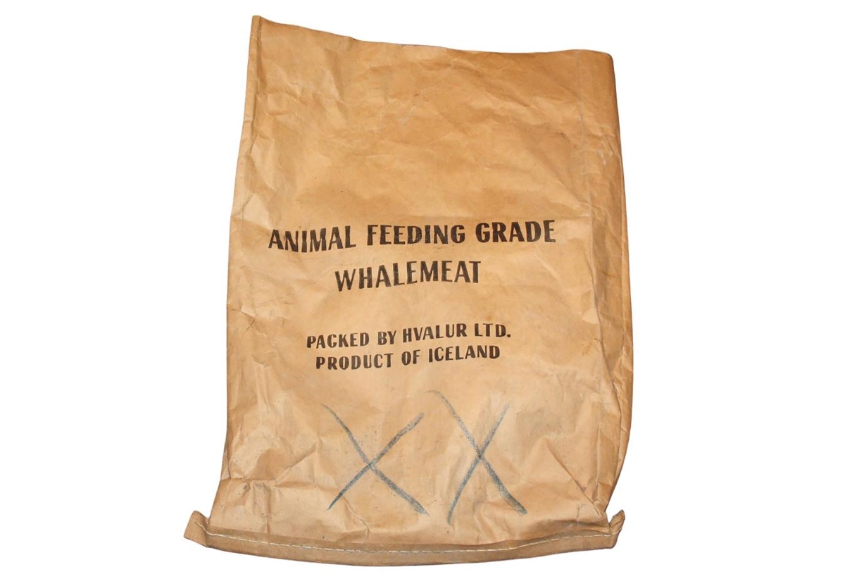 Texti: Animal Feeding grade whalemeat. Packet by Hvalur Ltd. Product of Iceland