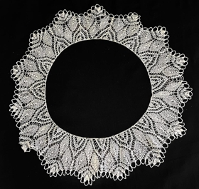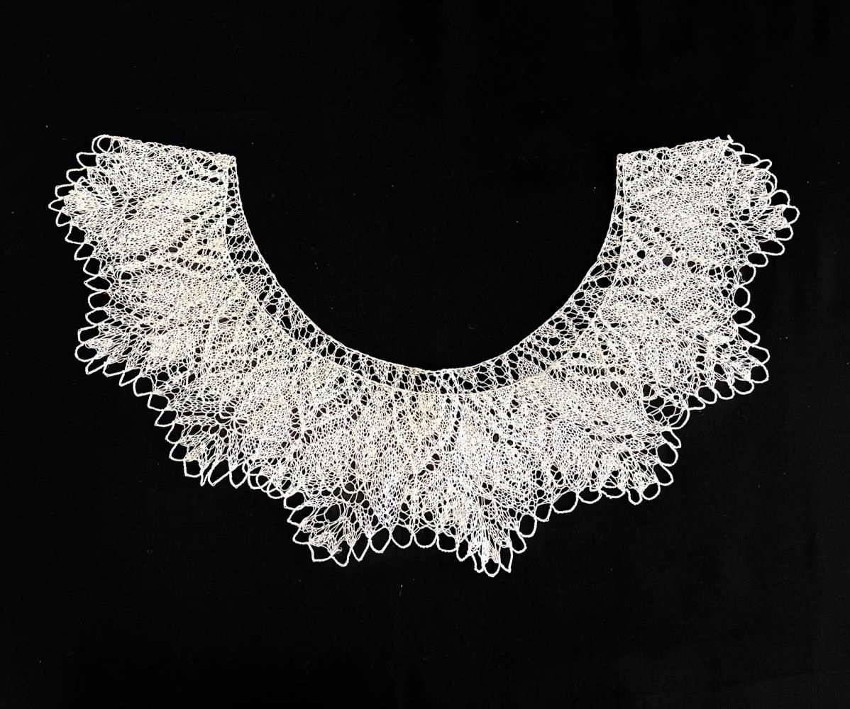 Heklaður kragi, afar fíngerður. Hvítt garn. Kraginn er heill hringur sem hægt er að leggja yfir axlirnar.