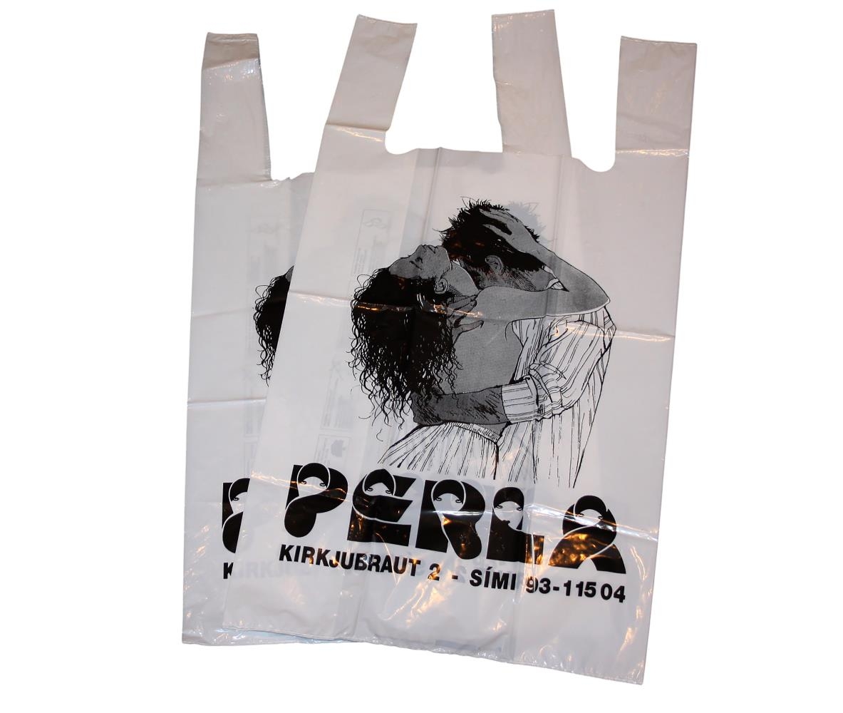 Hvítir plastpokar með svörtum stöfum og mynd.