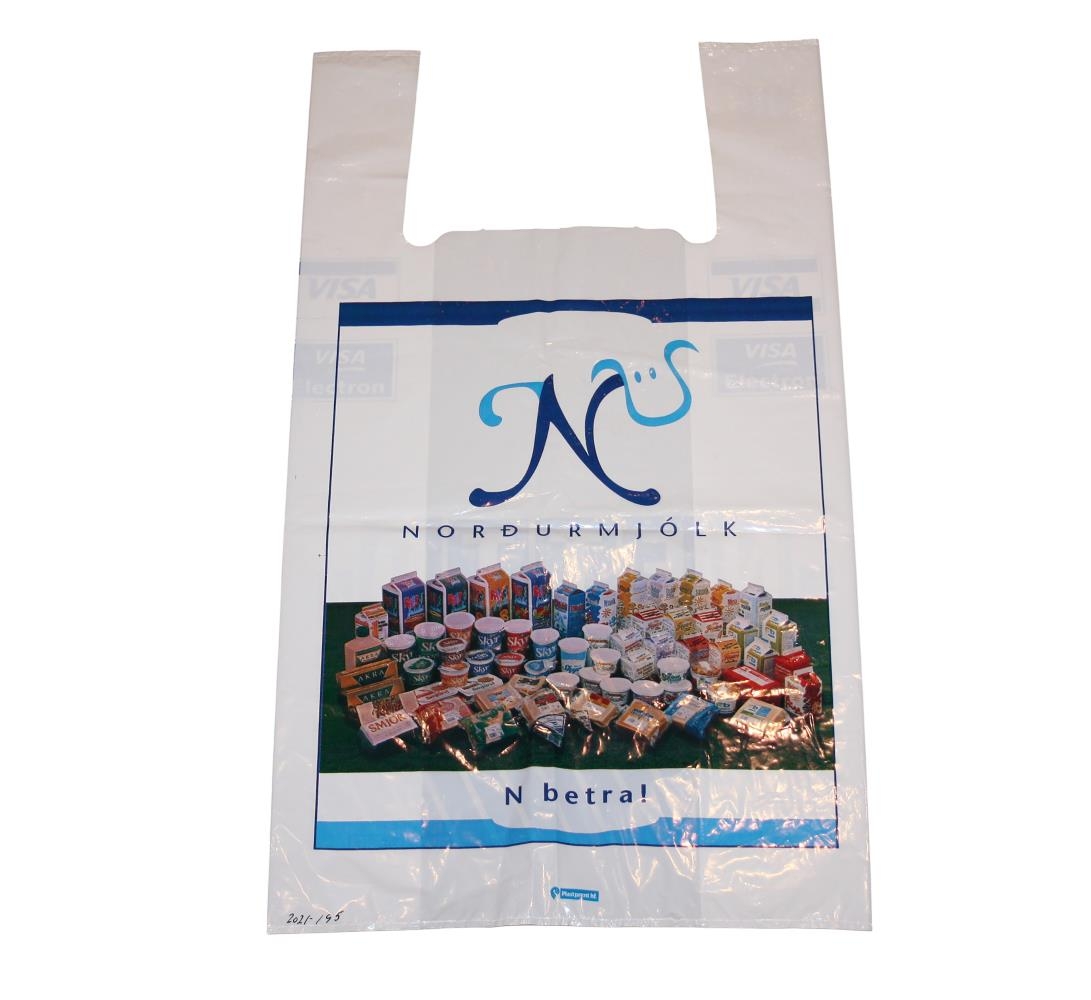 Hvítur plastpoki með bláum stöfum og á bakhlið er auglýsing frá Norðurmjólk.