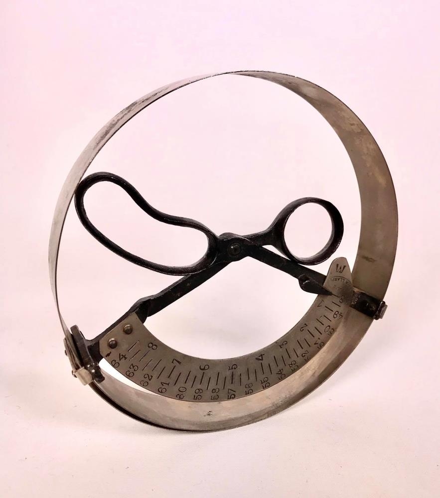Tæki til að mæla höfuðstærð. Hringlaga járn með haldi innan í sem eru í laginu eins og skæri án blaða. en skærin tengjast mælistiku og þegar skærin eru dregin saman minnkar málmhringurinn.
