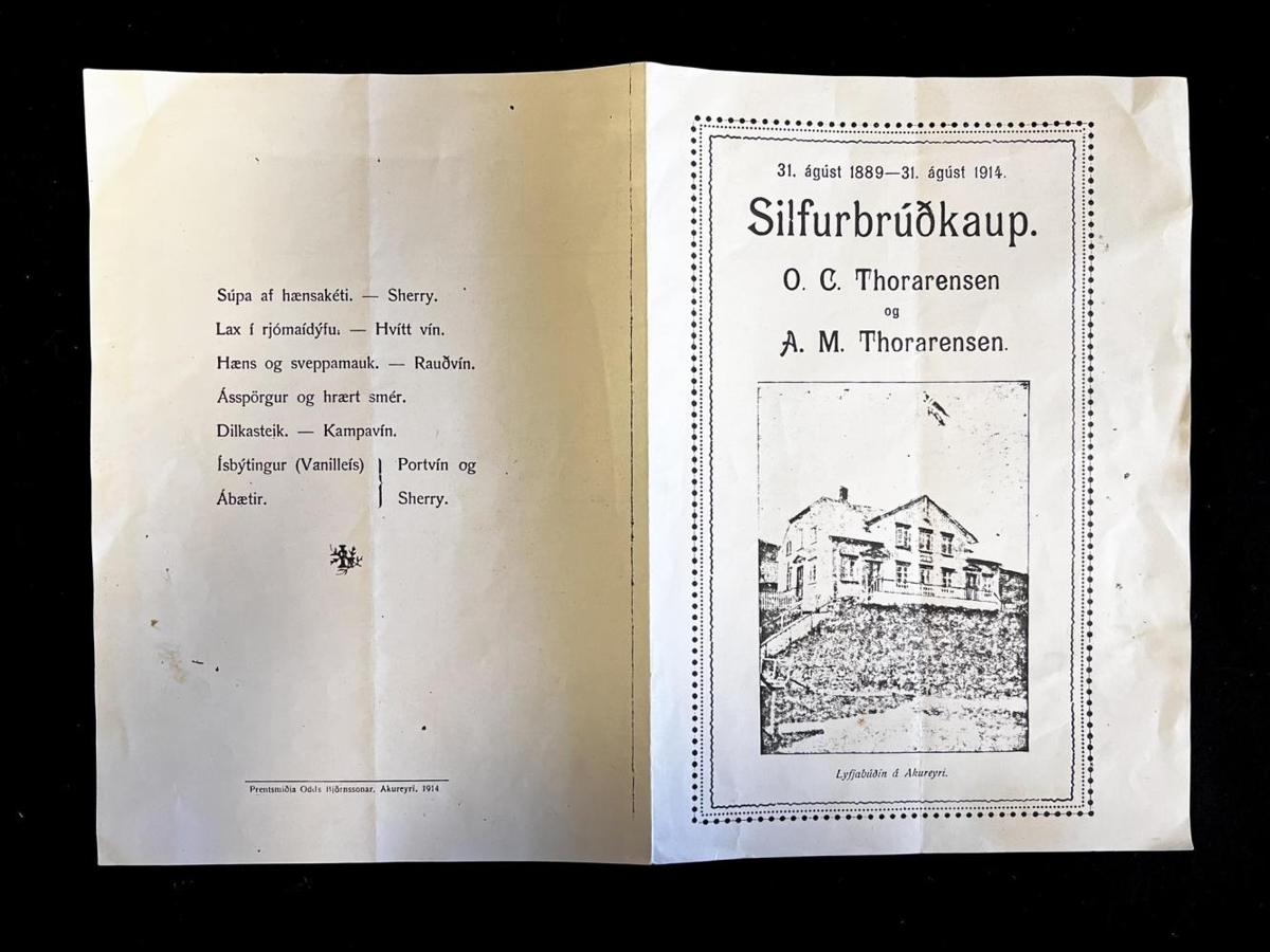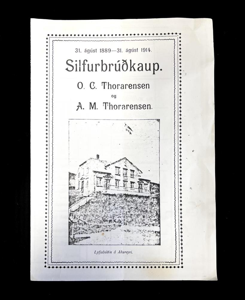 31. ágúst 1889 - 31. ágúst 1914. Silfurbrúðkaup. O. C. Thorarensen og A. M. Thorarensen (mynd af Aðalstræti 4, ,,Lyfjabúðin á Akureyri,,)
