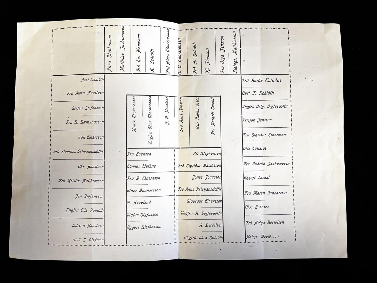 Einblöðungur með sætaskipan og matseðli í silfurbrúðkaupsveislu Ölmu og Odds Thorarensen. Pappírinn er í stærð A4, brotinn saman. Á forsíðu eru fyrirsagnir og mynd af Aðalstræti 4. Í miðjunni er teikning af sætaskipan í veislunni, teiknuð borð og nöfn gesta. Aftan á blaðinu er matseðill kvöldsins.