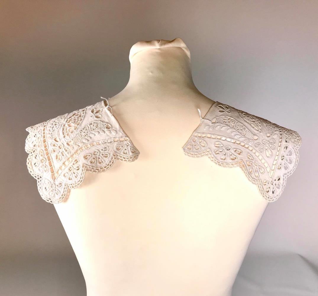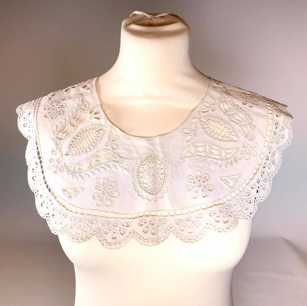 Kjólkragi, úr ljósu lérefti. Dömu kjólagragann saumaði Kristín Einarsdóttir rétt eftir aldamótin 1900. Þá var hún við nám í ,,kunst,, saumi í Danmörku. Hún var fædd á Akureyri 26. nóvember árið 1883 en dó úr sykursýki í Reykjavík 10. júní 1907.