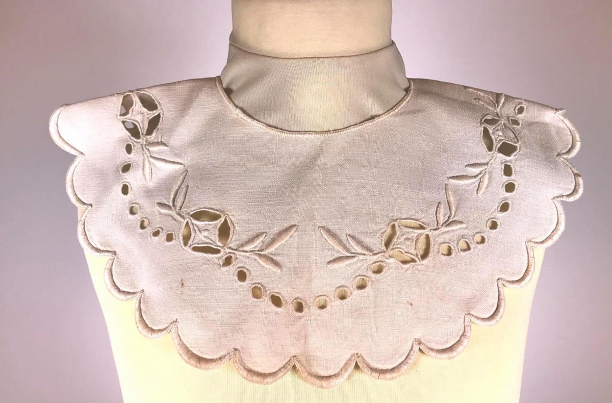 Slefkragi, ungbarna úr ljósu lérefti, hvítsaumur. Gefandi, Guðfinna er fædd að Hafnarstræti 88 (Gamla bankanum) á Akureyri 15. janúar 1913. Slefklútinn saumaði Sólveig Einarsdóttir, móðir Guðfinnu sem var fædd 27. apríl 1876 í Benediktsbænum á Akureyri, hvar seinna var hús Páls Einarssonar bæjarfógeta. Klútinn saumaði hún árið 1914 handa Guðfinnu.