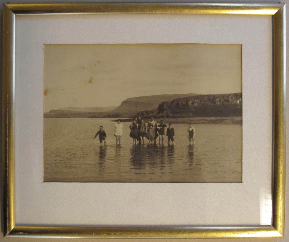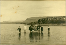 Hópur barna og unglinga auk einnar fullorðinnar konu standa í grunnu vatni spölkorn frá landi. Í baksýn er fjara og þar ofanvið lágt jökulsorfið klettanef. Fjær f. miðju er stærra fell, Úlfarsfell.