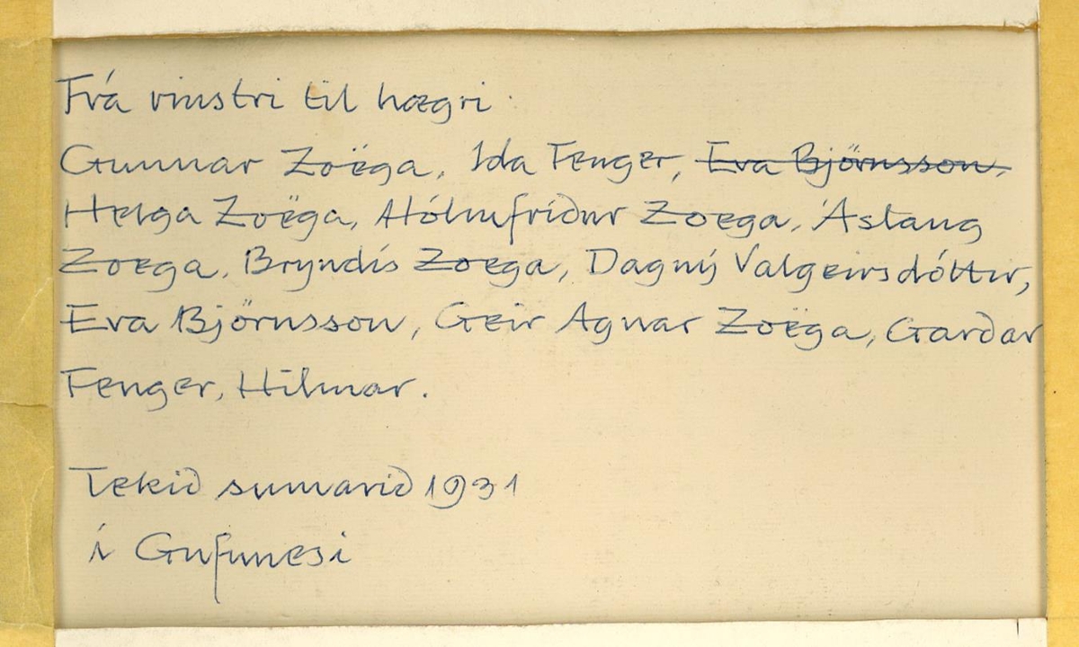 Á bakhlið er skrifað: Frá vinstri til hægri: Gunnar Zoëga, Ida Fenger, Eva Björnsson, Helga Zoëga, Hólmfríður Zoëga, Áslaug Zoëga, Bryndís Zoëga, Dagný Valgeirsdóttir, Eva Björnsson, Geir Agnar Zoëga, Garðar Fenger, Hilmar. Tekið sumarið 1931 í Gufunesi. Sjá nánar undir Fylgiskjöl.