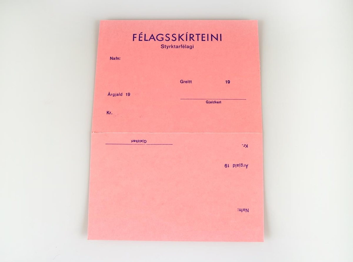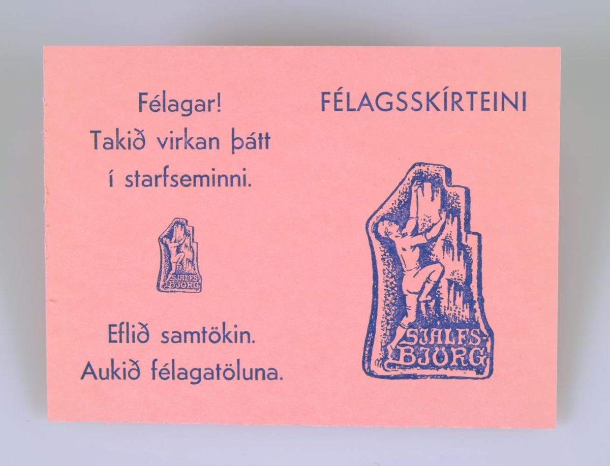 Félagsskírteini Sjálfsbjargar (Sjálfsbjörg - landssamband hreyfihamlaðra). Skírteinið er úr bleikum pappa (15,5 x 11,4 cm) með riflínu. Öðrum megin er merki Sjálfsbjargar prentað tvisvar í mismunandi stærð, á báðum hliðum er prentaður texti. Allt prent er í bláum lit.